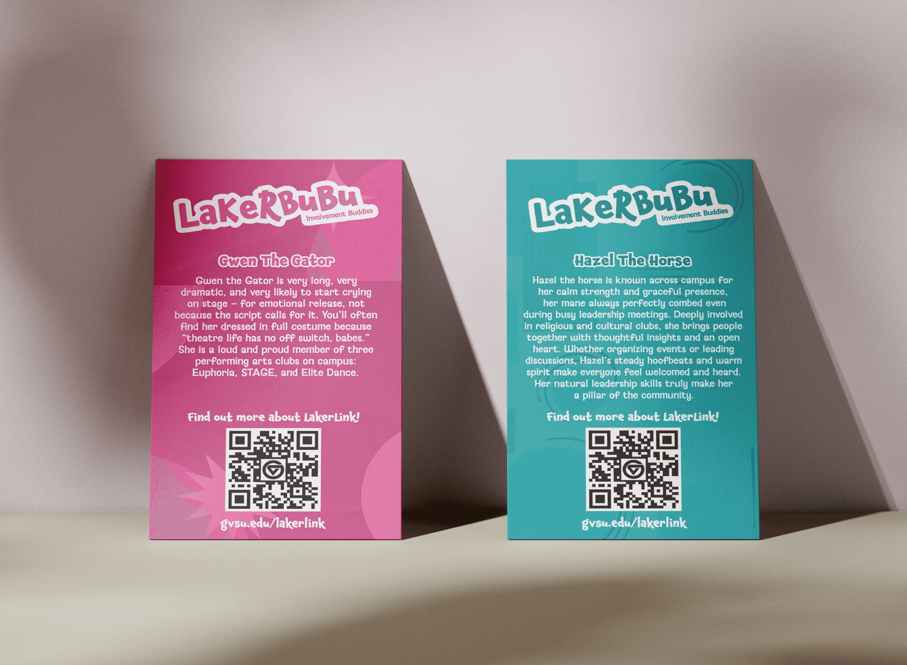 For the 2025 Campus Life Night, the tote bag was redesigned for a painting activity where students could color their own bags. I enlarged the new illustrations, turning the icons into a coloring page style layout. That same event, the Office of Student Life introduced their scavenger hunt prize as plush keychain animals distributed in mystery bags. I designed the t-shirts for each plush using the updated GVSU logo, as well as a set of sticker and collectable card design. Each card was paired with a different animal with a student organization category, giving each character its own personality and reason for why students should get involved on campus.